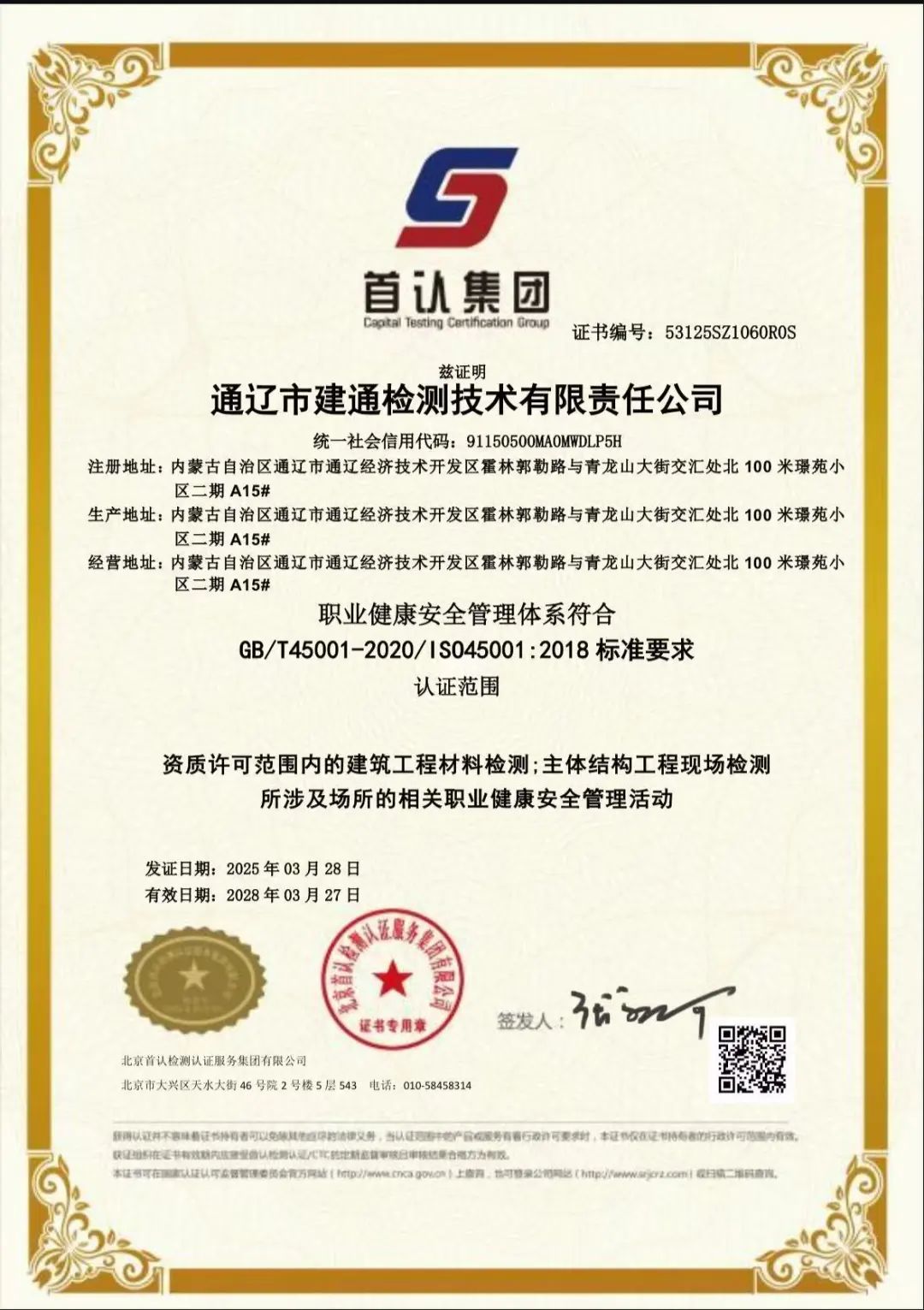 ISO45001职业健康安全管理体系认证,突显了建通检测公司对员工生命健康安全的重视,为员工构建安全环境,有效预防工伤和职业病提供保障。