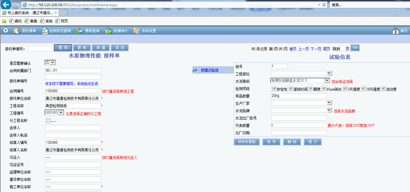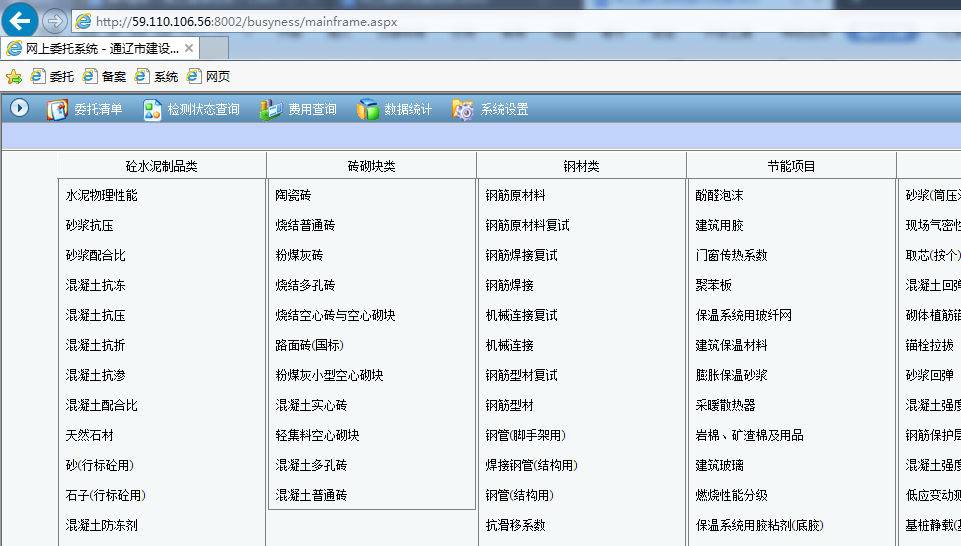 4、 在界面1-3中,用户可点击委托清单、检测状态查询、报告查询、费用查询、数据统计、系统设置了解相应的功能。在委托清单中点击新建按钮即可返回到界面1-3。选择想要委托的试验项目,比如点击水泥,即可进入界面1-4。为了用户信息的安全,建议首次登陆的用户在系统设置里更改自己的密码。